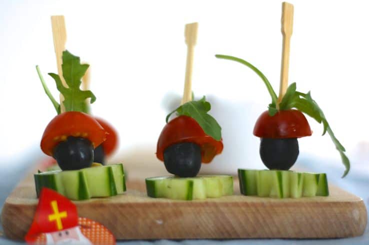 Deze zwarte pietjes zijn heel onschuldig! Ze doen niet mee in de Zwarte Pieten discussie en maken je niet dik. Fijn hè? Je maakt ze door een zwarte olijf op een prikkertje te prikken met daarop een gehalveerde cherrytomaat als muts met een rucola-veer. Lekker met een gezond dipje erbij zoals tzaziki. Het kookfilmpje daarvan zie je hier.
