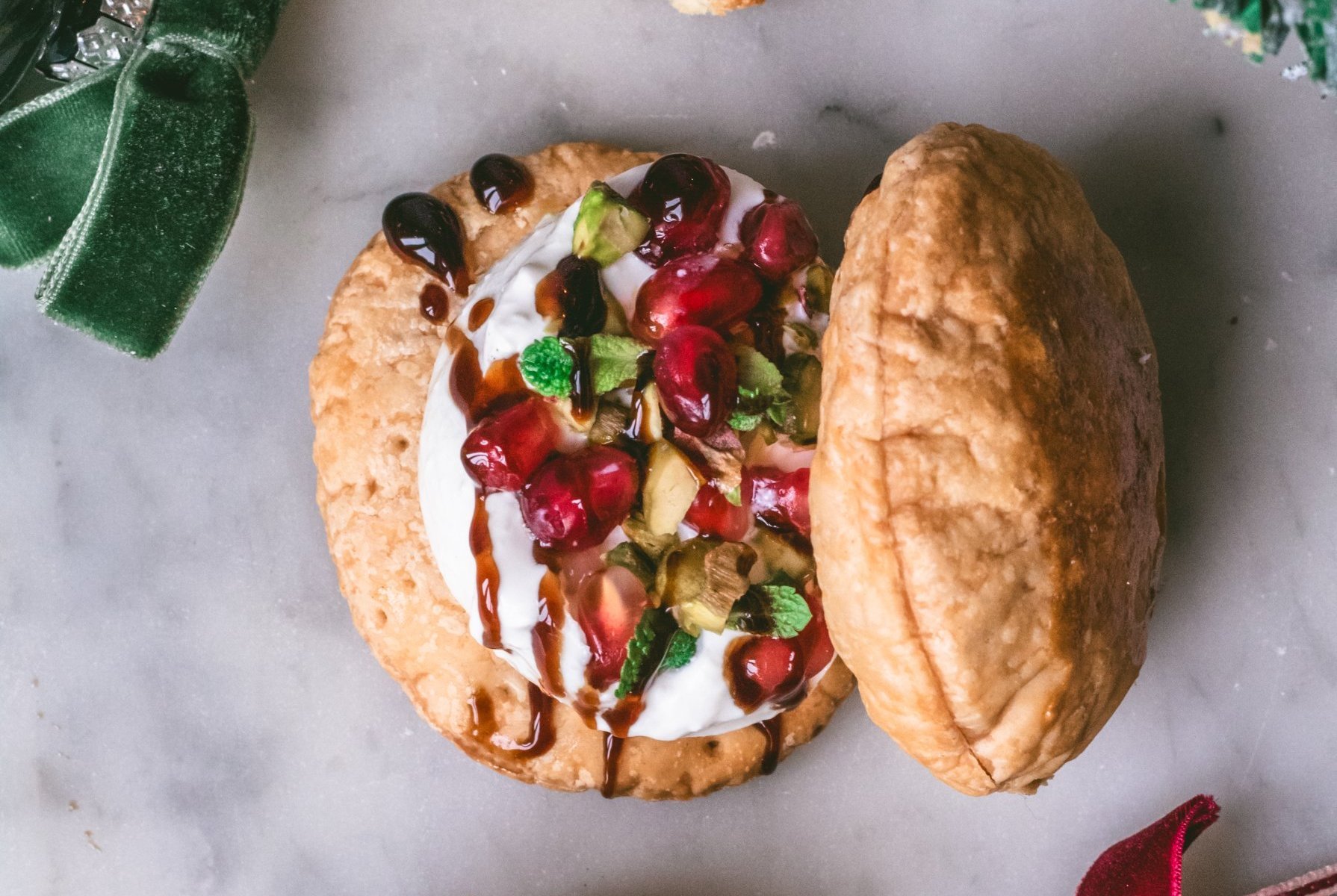 3. Mini burratine tompouce met granaatappel, pistache en balsamico