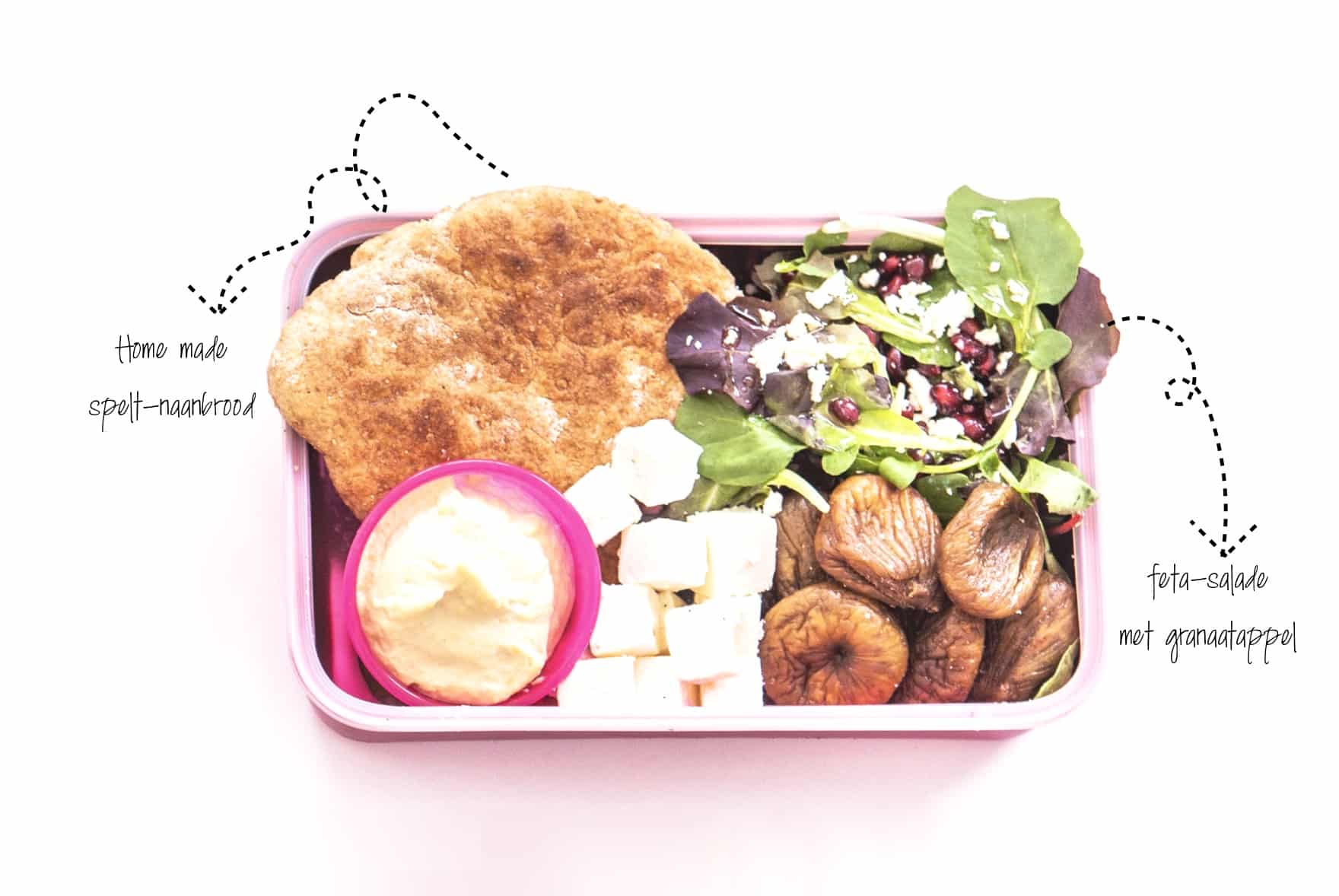 Dan lunchen we ‘s middags altijd wel met iets van salade, zoals de  feta-granaatappeltjessalade van de foto. We nemen allerlei ingrediënten mee en maken zelf een dressing. In ons nieuwe kookboek delen we heel veel dressing-inspiratie en salade ingrediënten to go, net als het recept voor home made speltnaan, die je ook in het nieuwe boek kunt vinden!