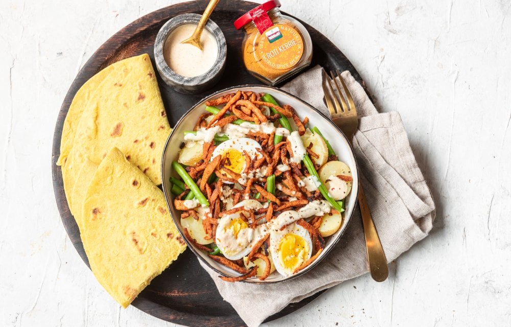Ook in een salade zijn krieltjes heerlijk. Dit keer bakken we ze met schil, en daardoor hebben ze zo’n lekkere bite. Nog een gekookt eitje en wat dressing on top, en je bent helemaal klaar voor je lunch of diner in het park.