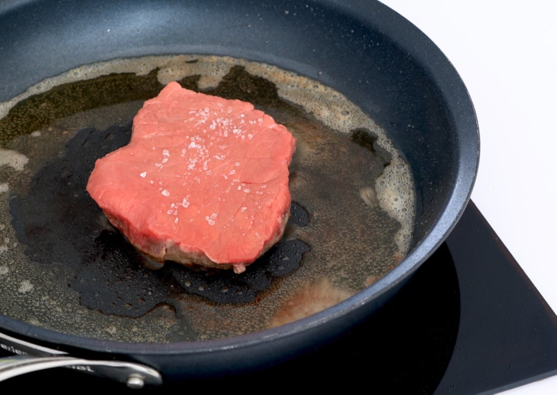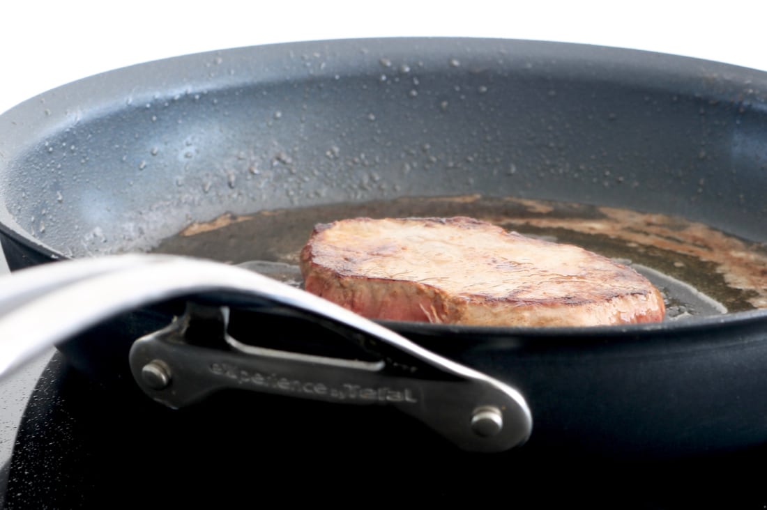 Het is me zo vaak overkomen dat ik met haast een stukje vlees bakte en vervolgens een soort van gekookt stukje vlees uit de pan haalde. Terwijl je juist een krokant goudbruine korst wilt en vervolgens van binnen super mals vlees. Een hete pan does the trick. Ik laat mijn Experience by Tefal koekenpan zonder boter of olie eerst warm worden tot de Thermo-Spot van de pan effen rood kleurt (de temperatuur is dan rond de 180 graden), daarna doe ik pas de olie erbij. Olie wordt heter dan boter, dus ik laat eerst de olie warm worden, vervolgens doe ik er een klontje boter bij en als die gesmolten is en niet meer bruist leg ik het vlees in de pan. Het mooie aan mijn Experience by Tefal pan is dat deze op een inductie kookplaat niet warmer wordt dan 230 graden, dus té heet kan de pan niet worden. Ik bak vervolgens het vlees een paar minuten aan een kant zonder het vlees te verplaatsen, zodat die kant echt goed dicht schroeit en krokant en bruin wordt. Dan draai ik het vlees om, bak de andere kant even op hoog vuur krokant en zet dan het vuur lager. Dan ga ik het vlees bewegen en schep ik een paar keer met een lepel het kookvocht over het vlees.