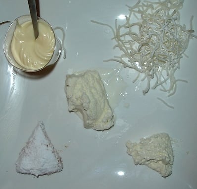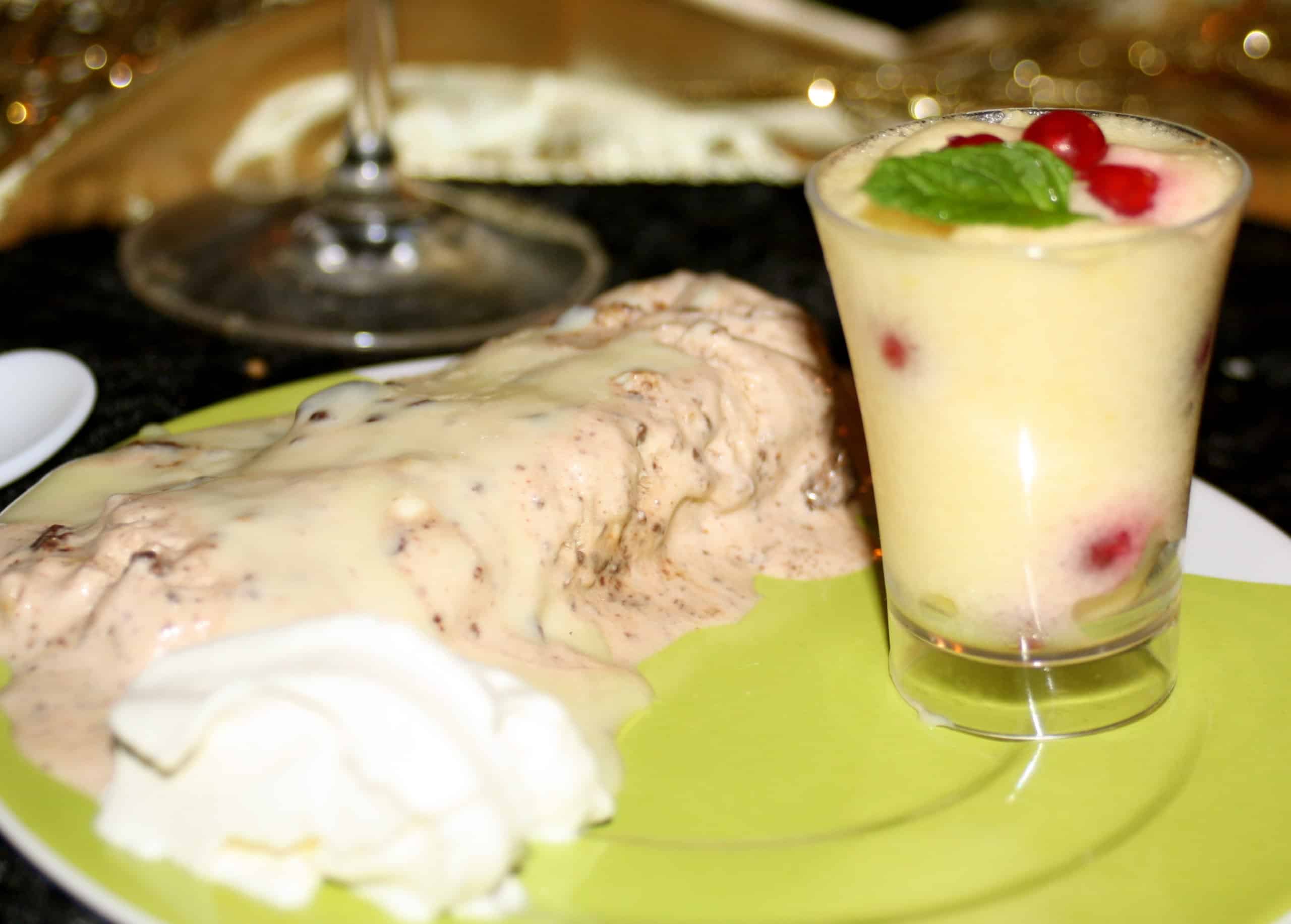 Witte chocolademousse, een kerstboom-kokosmacroon, roomijs en slagroom en gepofte mihoen met poedersuiker.