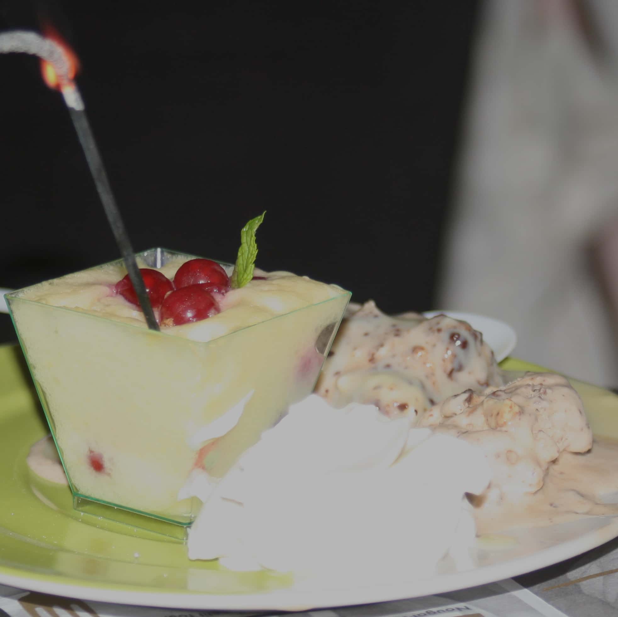 Een witte chocolade tompouce met ijs, een warme chocolade/pecan brownie, bananen-straciatellaroom in een chocoladebekertje, warme karamelsaus en een cacao-kerstboom.