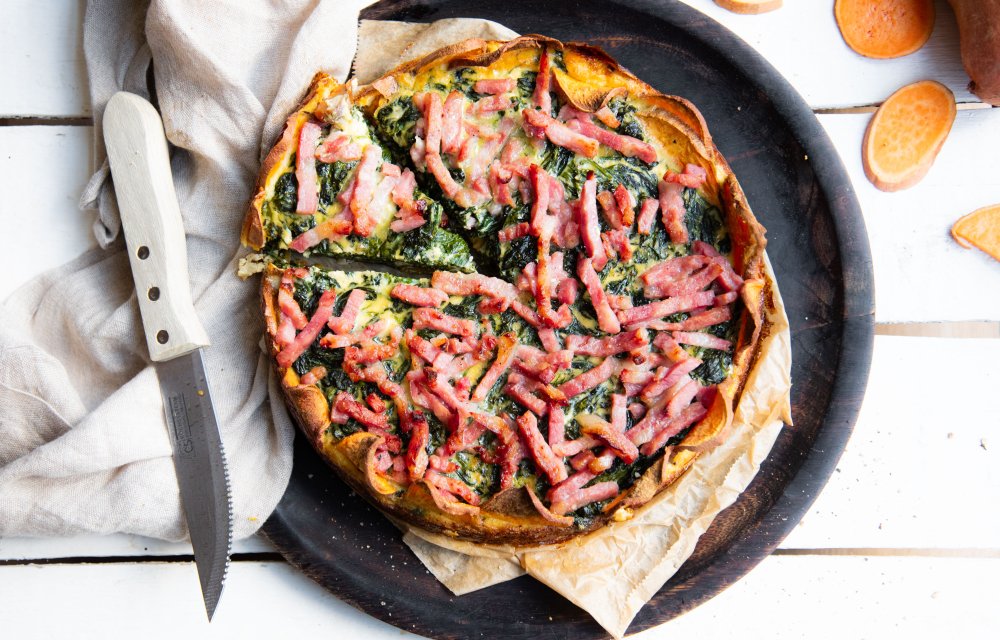 Kijk nou wat een mooierd, deze glutenvrije zoete aardappelquiche met spinazie. En dat met maar 5 ingrediënten, hè! We maken ‘m met spinazie, ei, kookroom, spekjes en helemaal fijn: de bodem is gemaakt van zoete aardappel. Vandaar glutenvrij dus!